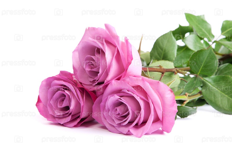 Три свежие розовые розы на белом фоне