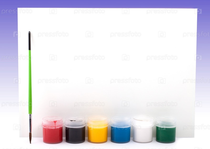 Краски с кистью и бумагой на синем фоне