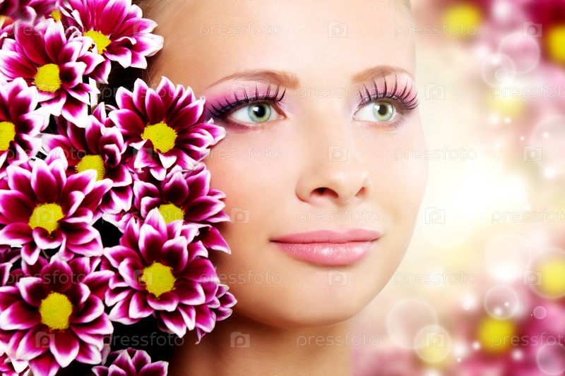 Красивое женское лицо с хризантемами