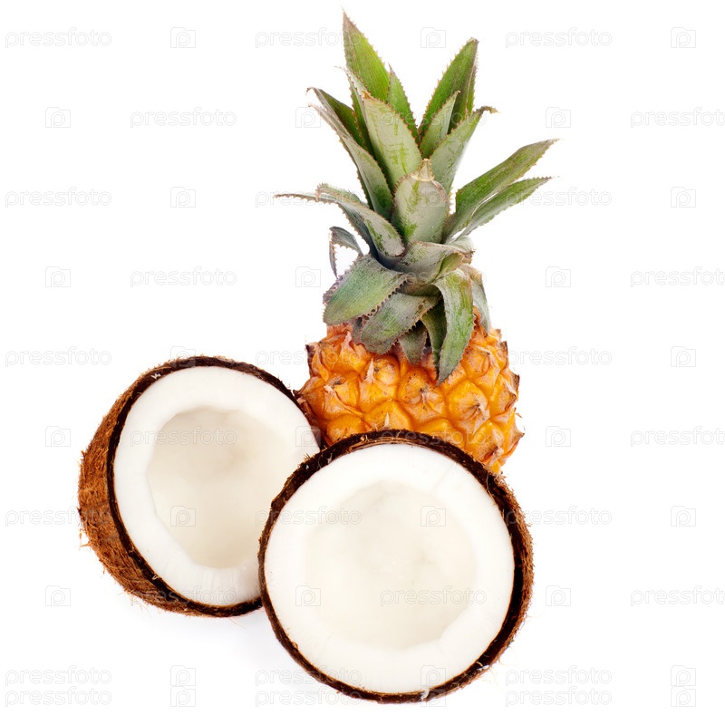 Кокос и ананас, изолированные на белом