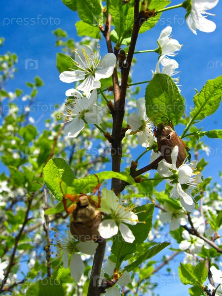 Майские жуки взбираются по цветущей сливе на фоне голубого неба