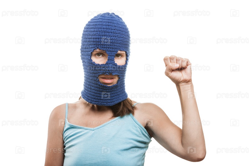Символ протеста или бунта. Девушка в балаклаве или маске на голове показывает поднятый кулак