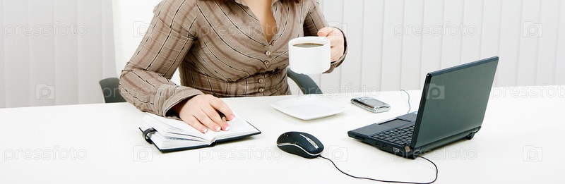 Женщина пьет кофе на работе