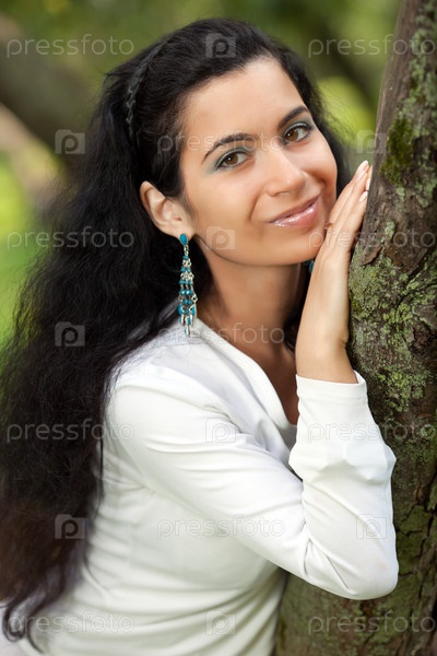Красивая восточная девушка стоит, прижавшись к яблоне