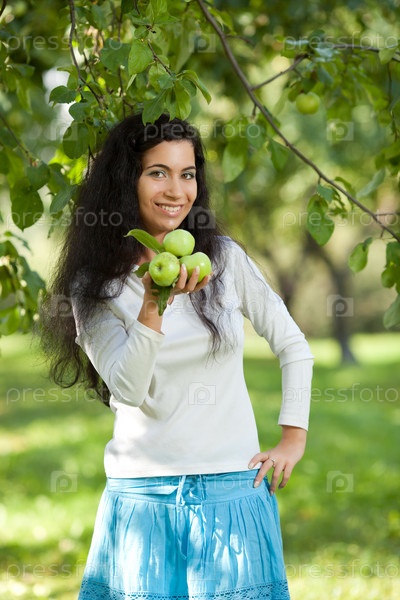 Девушка держит яблоки и широко улыбается