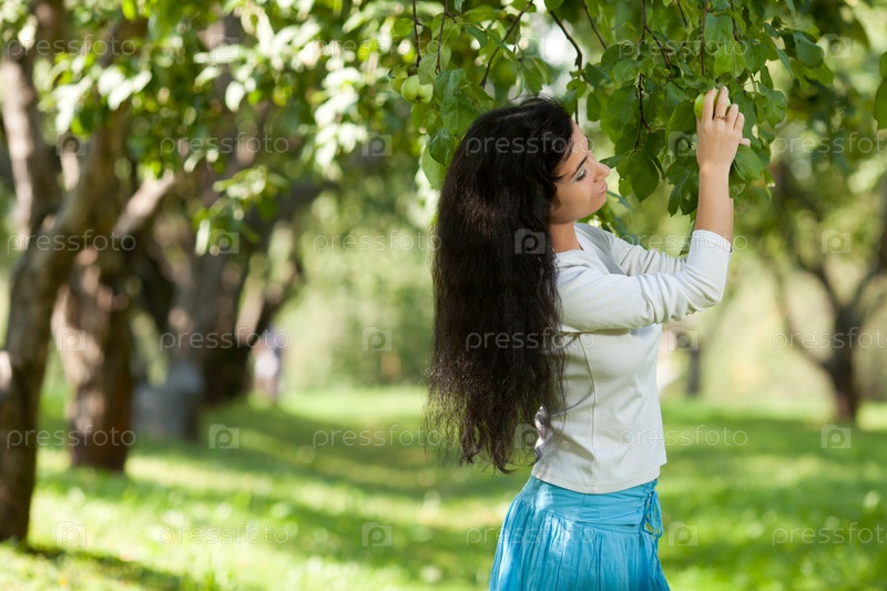 Красивая девушка срывает яблоко с ветки