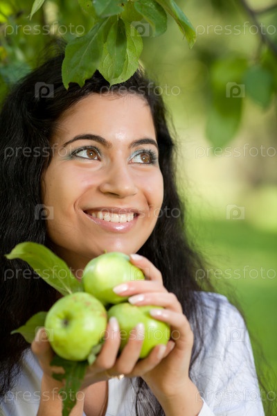 Девушка держит яблоки и широко улыбается