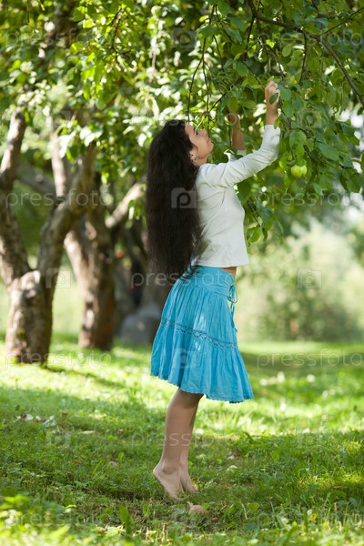 Красивая девушка срывает яблоко с ветки