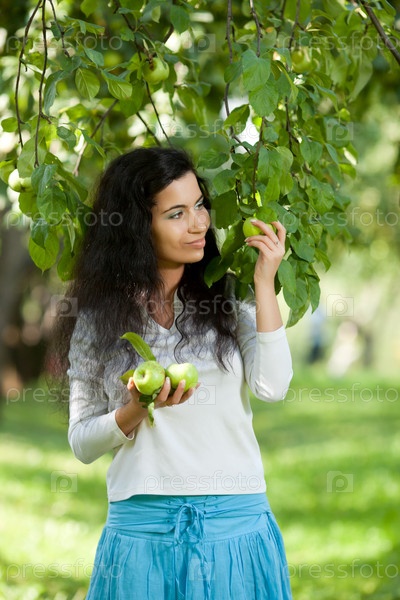 Красивая девушка срывает яблоко с ветки