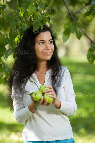 Девушка держит яблоки и широко улыбается