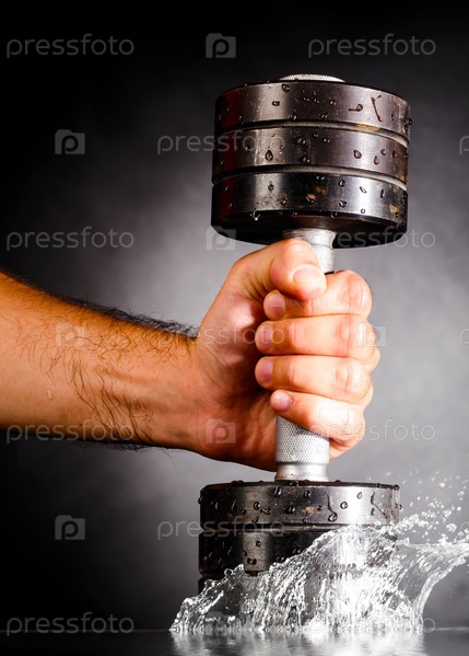 Мужская рука держит металлическую гантель в воде