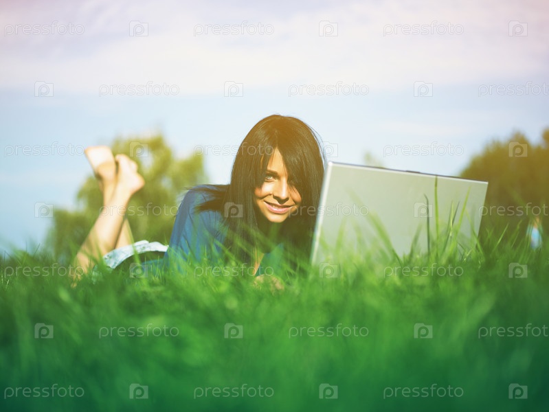 Молодая женщина с ноутбуком в парке