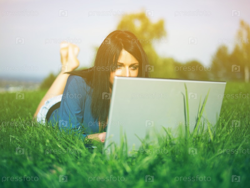 Молодая женщина с ноутбуком в парке
