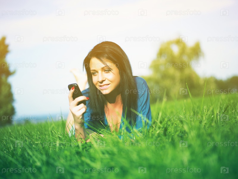 Молодая женщина с мобильным телефоном в парке