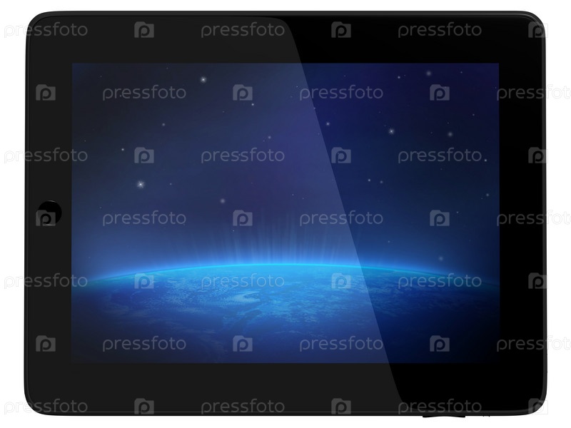 Планшетный компьютер с планетой Земля, вид из космоса