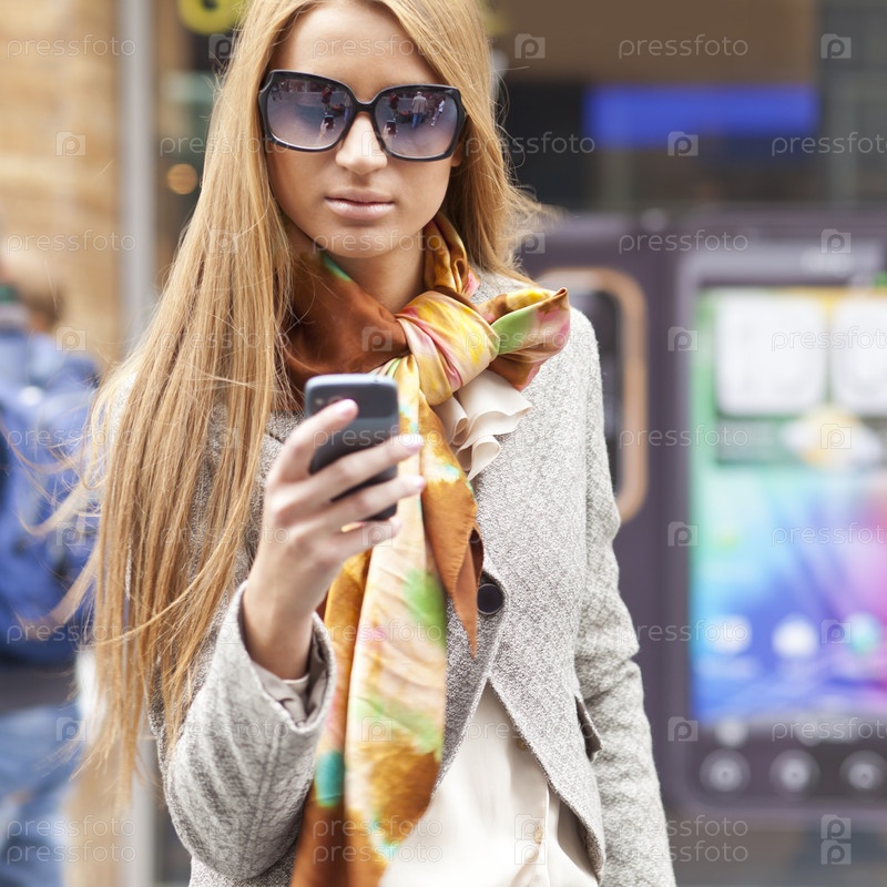 Модная молодая женщина со смартфоном идет по улице