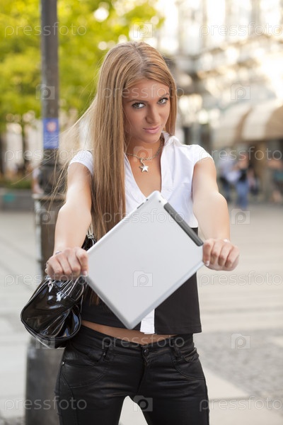 Молодая женщина с планшетным компьютером на улице