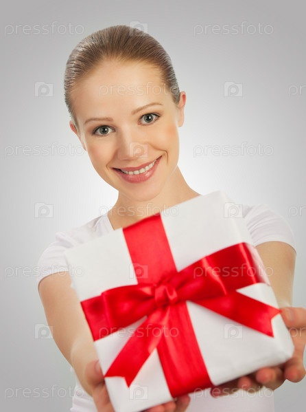 Красивая молодая женщина с рождественским подарком с красной лентой в руках на сером фоне