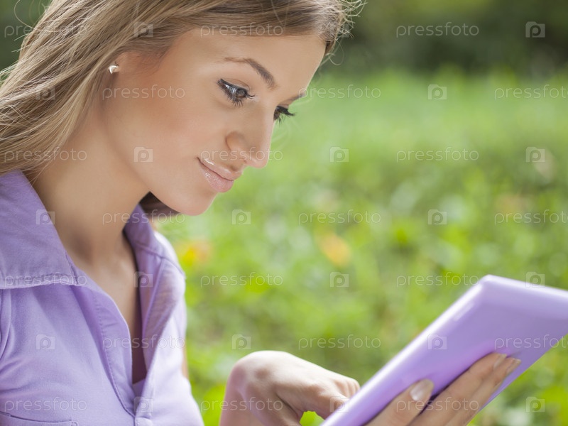 Красивая женщина с планшетным компьютером в парке