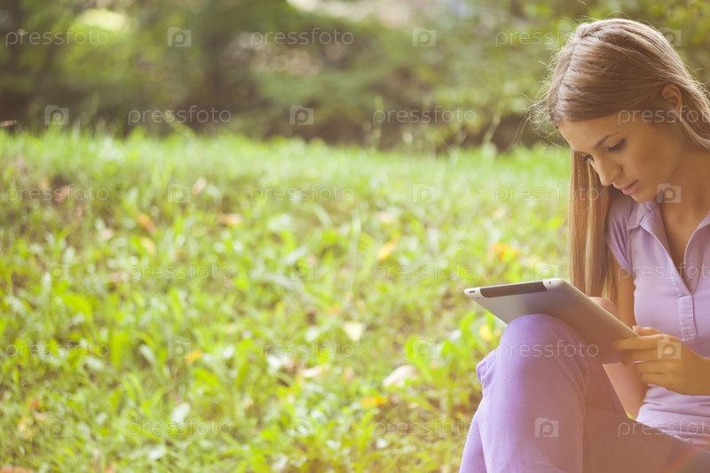 Красивая женщина с планшетным компьютером в парке