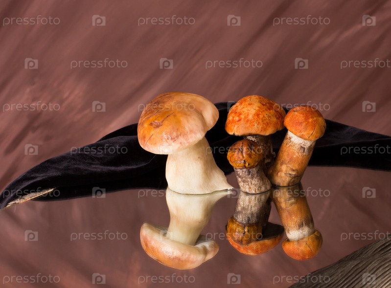 Благородные грибы, белый и подосиновик с зеркальным отражением