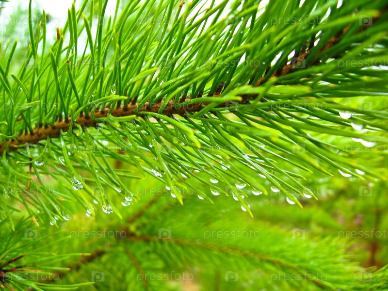 Ветви молодой сосны с каплями воды