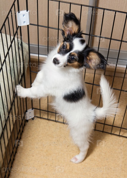 Щенок породы папильон в вольере