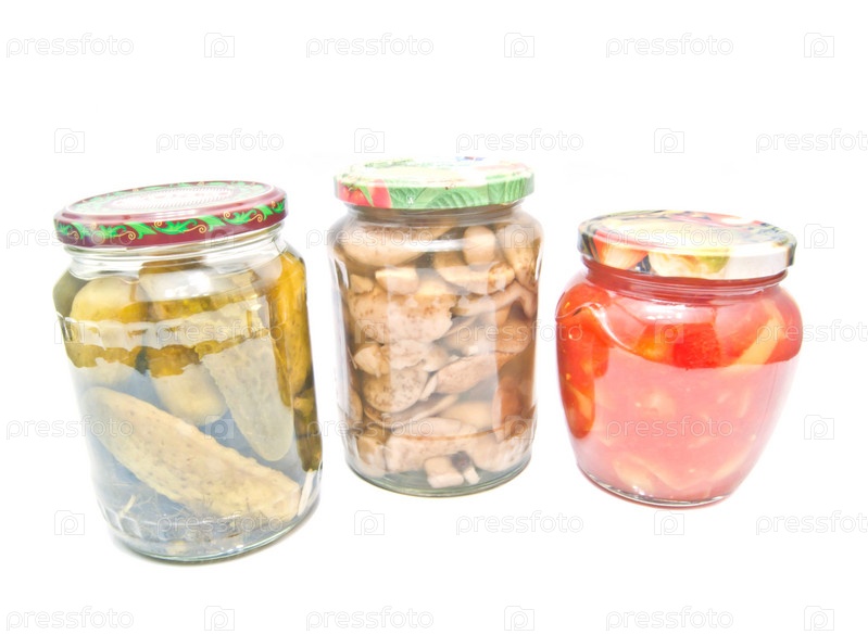 Три баночки с маринованными овощами на белом фоне