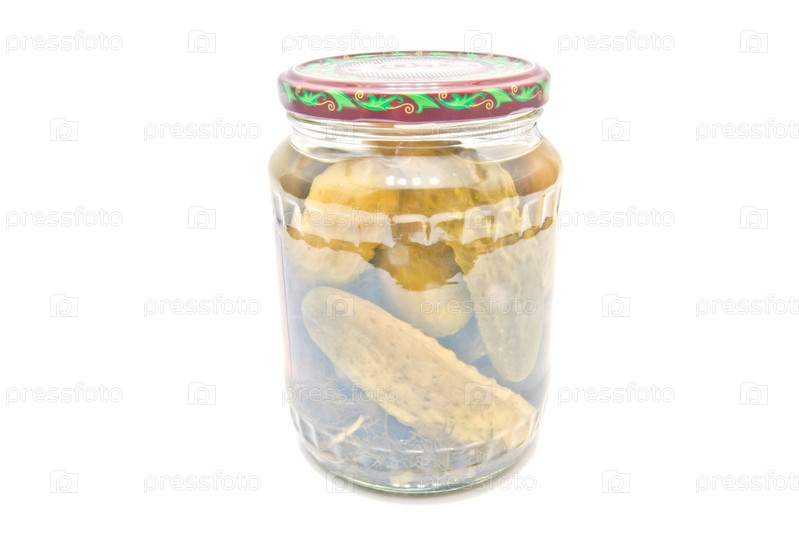 Банка с огурцами крупным планом на белом фоне