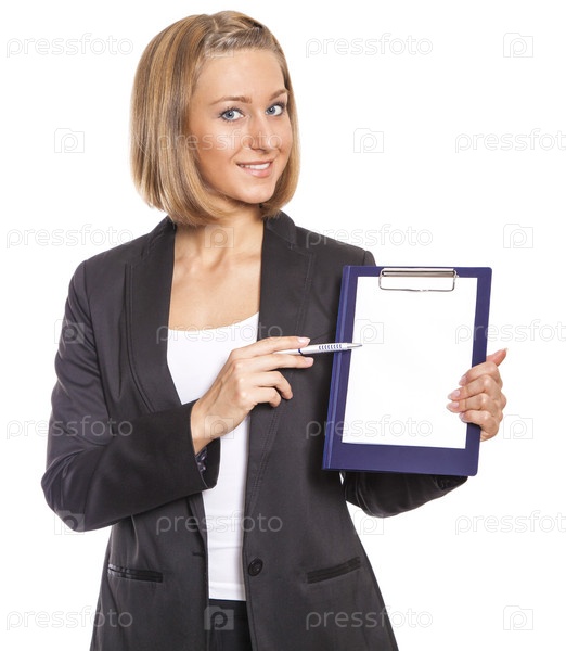 Красивая бизнес-леди указывает ручкой на пустой документ