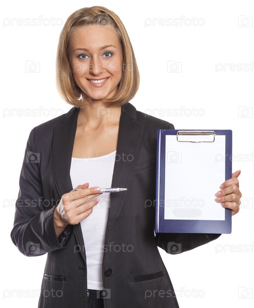 Красивая бизнес-леди указывает ручкой на пустой документ