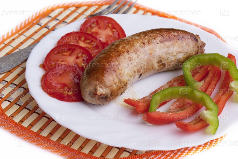 Аппетитная жареная колбаска-гриль с свежими овощами на белом фоне