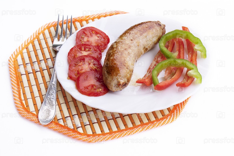 Аппетитная жареная колбаска-гриль с свежими овощами на белом фоне