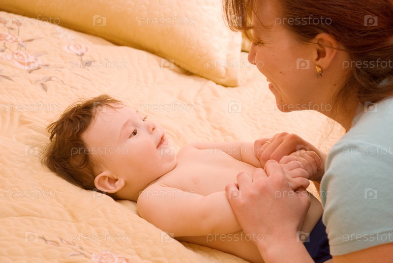 Малыш лежит на кровате и смотрит на маму