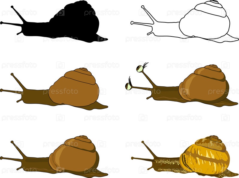 Одна Улитка с различными окрасками, мультипликационный и реалистичный стиль