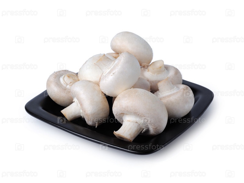 Белые грибы на черном листе, изолированные на белом фоне