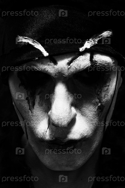 Театральный актер с темным макияжем на лице