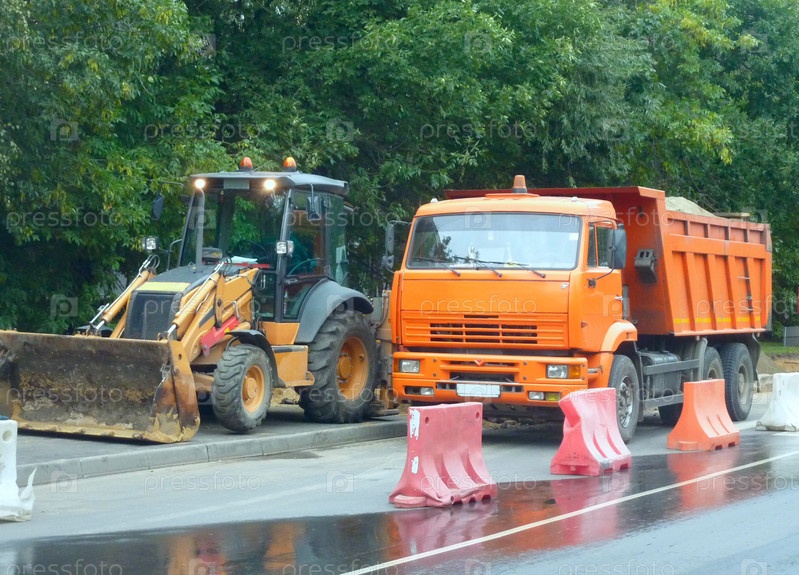 Самосвал и бульдозер на дороге
