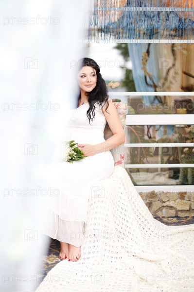 Красивая брюнетка с букетом ландышей