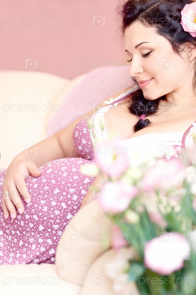 Красивая беременная брюнетка с цветами