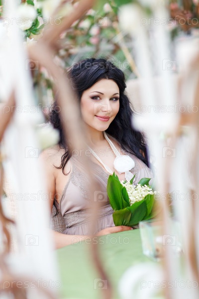 Красивая брюнетка с букетом ландышей