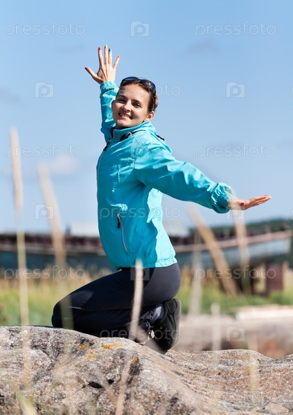 Красивая девушка в куртке стоит на коленях на скале
