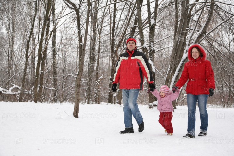 Мама и папа с детьми в парке зимой