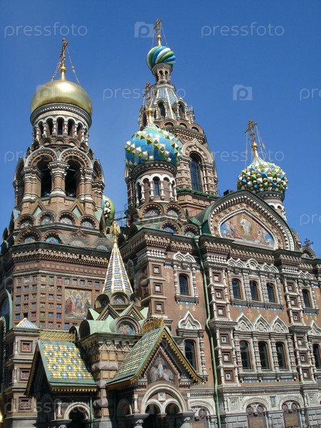 Расписная церковь с куполами на голубом фоне (Собор Спаса-на-Крови)