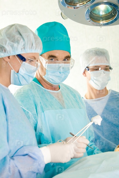 Изображение пожилого хирурга, смотрящего на камеру во время операции