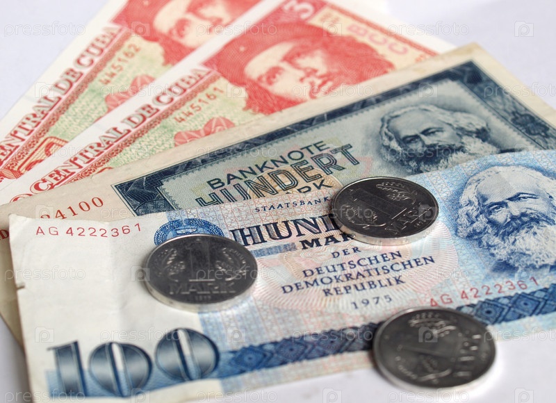 Старые банкноты с Карлом Марксом (ГДР) и Че Геварой (Куба)
