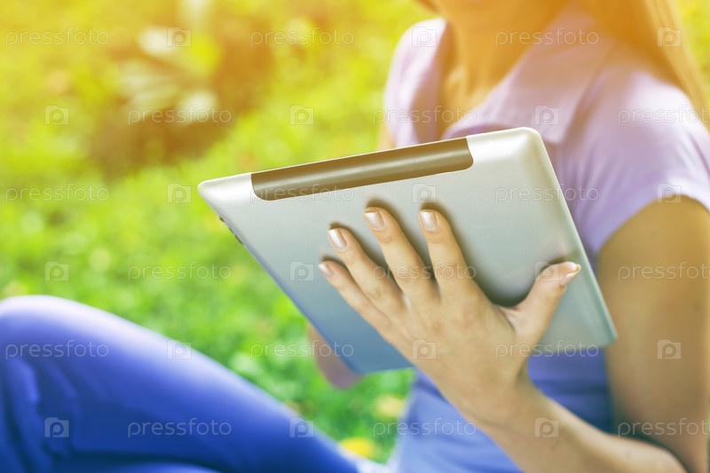 Красивая женщина с планшетным компьютером в парке
