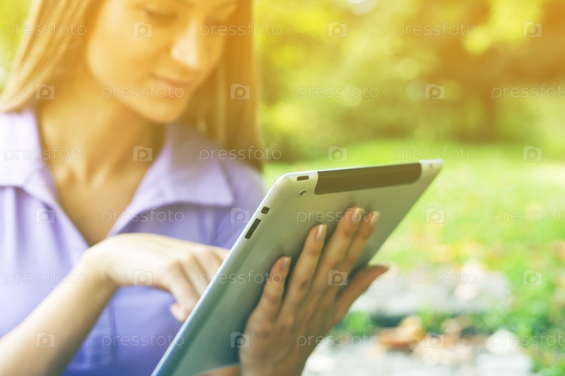 Красивая женщина с планшетным компьютером в парке