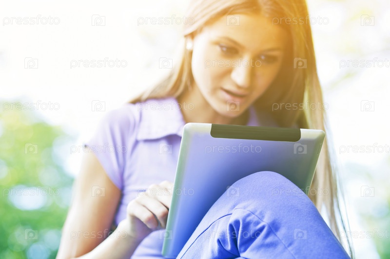 Красивая молодая девушка с планшетным компьютером в парке