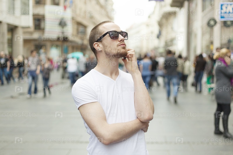 Молодой человек в солнцезащитных очках с телефоном на улице